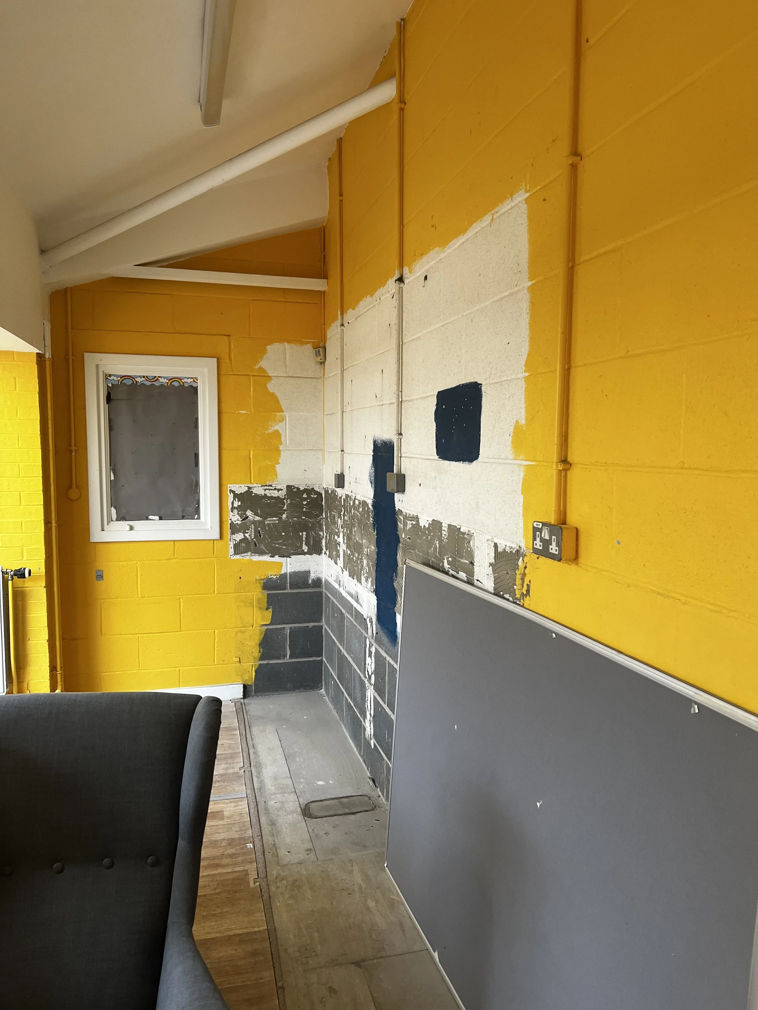 I was approached in the last weeks of the summer term to paint a mural in the library at Churwell Primary. They have recently become a part of the Resilience Trust and the Trust was giving them money for a new library. I went along to measure up and didn’t expect it to be 63 square meters of yellow wall, with multiple surfaces, tiles and some fairly big holes. They had already names the different zones - Solar Library and Luna Lounge. They wanted trees and something relaxing. So I painted a night sky with a moon and woodland.